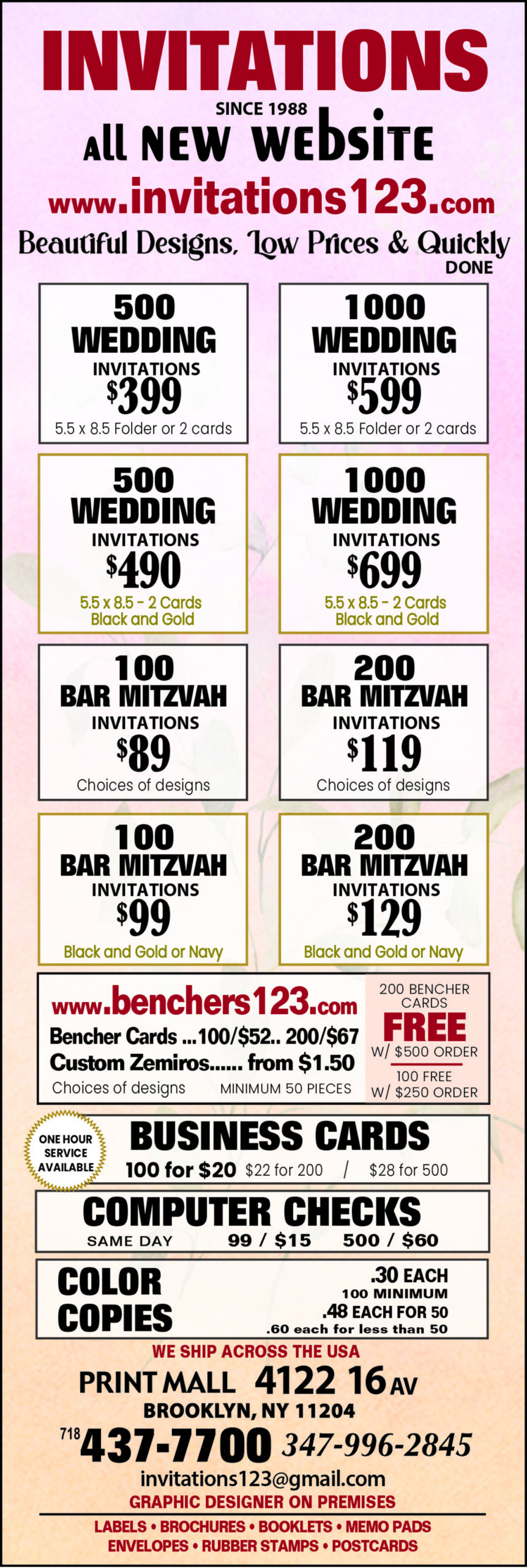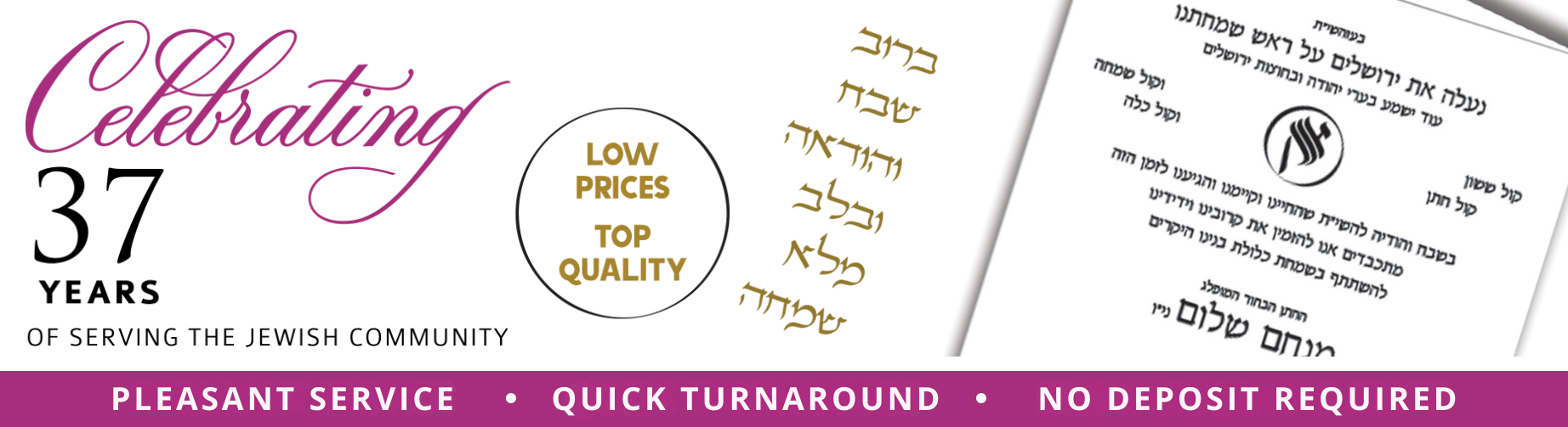 We pride ourselves on producing quality Jewish wedding invitations, Bar Mitzvah invitations, and Bat Mitzvah invitations at low cost. Our staff is knowledgeable, experienced, and pleasant. Our typesetters and designers are both talented individuals and professionally trained. Likewise our website is formatted to easily select layouts and fonts or to request customization if you prefer. Once your order is received you will receive a proof. We will not print till you approve. Our production department operates with superior efficiency, and all orders are processed quickly. This combination of commitment and skill assures that every wedding, Bar Mitzvah or Bat Mitzvah invitation that is produced in our shop is a true masterpiece and is promptly completed.