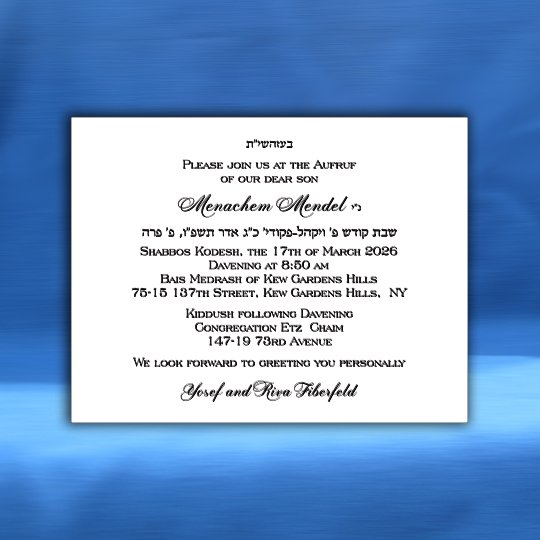 This unique Aufruf Card, printed on Wove card gives your invite that extra edge. Definitely worth the added investment. A forward choice, tip- top quality!