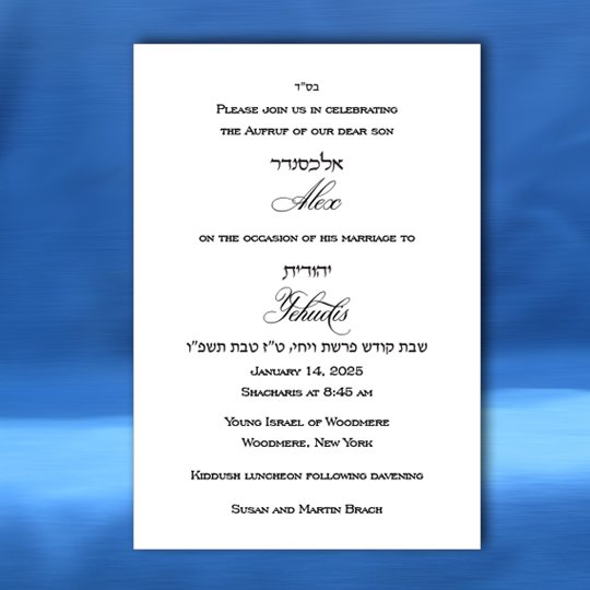Please choose quantities for your Jewish Wedding invitations and additional cards at the right. You will get to choose your fonts, layout and monogram as you place your order.