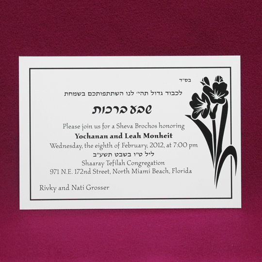 Here is another of our creations for our budget line of Sheva Brochot cards. Enjoy the sharpness of this card printed in either black raised or in one of our many available colors. Discover the variety of colors we offer by clicking on ‘ink colors’. Use this card as shown or create a design of your own.