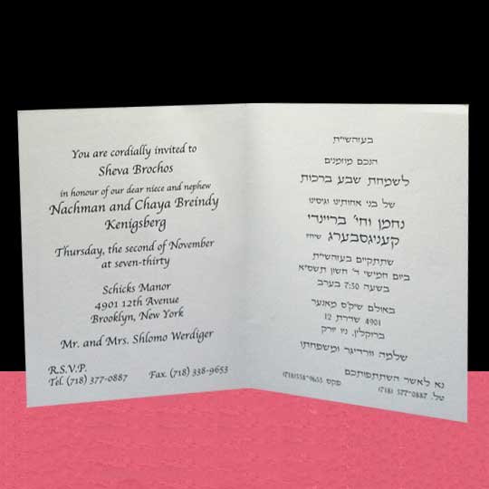 With our quality silk paper you will be inviting your guest with elegance at a price that can’t be beat. Use the format we created or create one of your own. We will be glad to be a part of your simcha and coordinate the invitation to match you Sheva Brochot theme.
