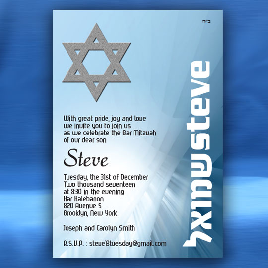Both the Hebrew font choices and the English font choices have separate categories for selecting a font. One category is for the general text and one category is for selecting a font for your son’s name. This way you can be truly creative in setting a personal touch to your Bar Mitzvah invitation. Alternatively, you can request that we select the perfect fonts for you.