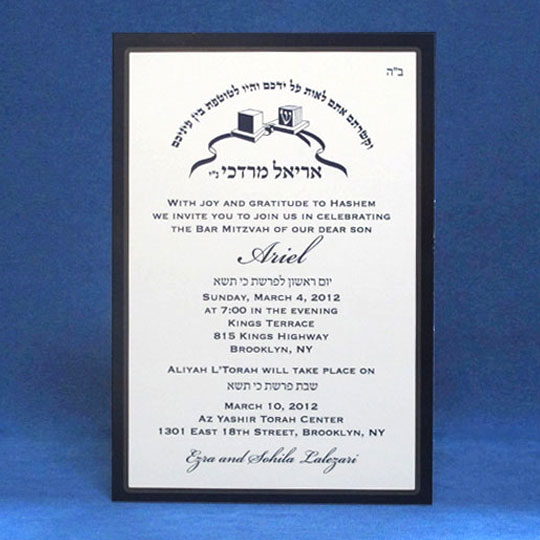 This has been one of our best sellers during the past few years. It’s neat, it’s classy and your perfect choice when ordering Bar Mitzvah invitations. Some of our customers feel the look reflects the concept of a card with a backing. Thus giving a more elegant feel to the invitation. It is however a single card.