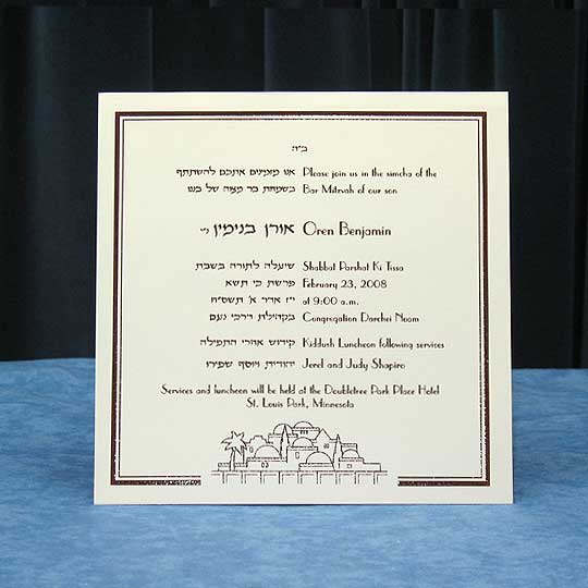 Please choose quantities for your Bar Mitzvah invitations and additional cards at the right. You will get to choose your Hebrew fonts, English Fonts, layout and monogram as you place your order.