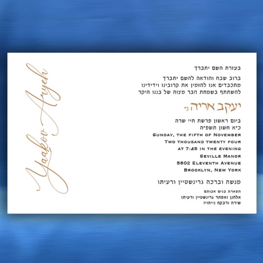 Both the Hebrew font choices and the English font choices have separate categories for selecting a font. One category is for the general text and one category is for selecting a font for your son’s name. This way you can be truly creative in setting a personal touch to your Bar Mitzvah invitation. Alternatively, you can request that we select the perfect fonts for you.