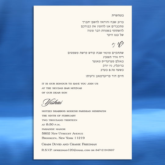 Both the Hebrew font choices and the English font choices have separate categories for selecting a font. One category is for the general text and one category is for selecting a font for your son’s name. This way you can be truly creative in setting a personal touch to your Bar Mitzvah invitation. Alternatively, you can request that we select the perfect fonts for you.