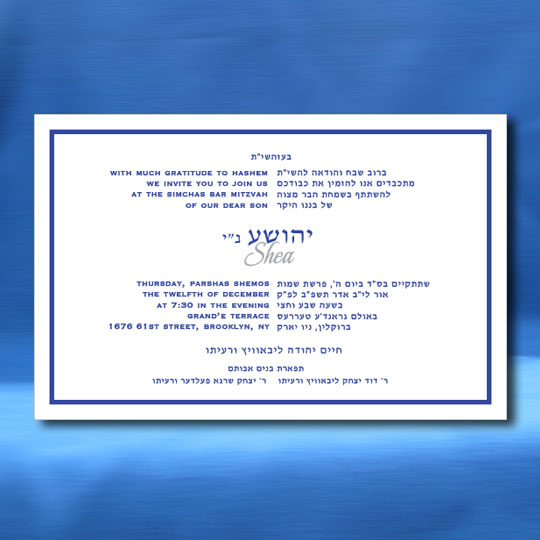 Both the Hebrew font choices and the English font choices have separate categories for selecting a font. One category is for the general text and one category is for selecting a font for your son’s name. This way you can be truly creative in setting a personal touch to your Bar Mitzvah invitation. Alternatively, you can request that we select the perfect fonts for you.