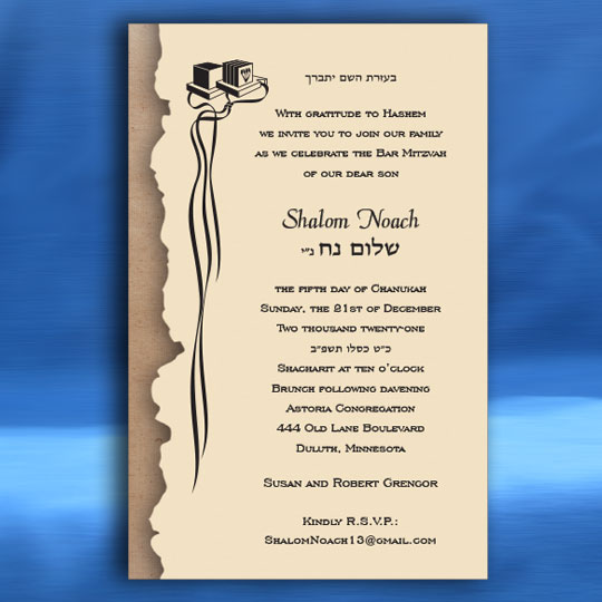 Both the Hebrew font choices and the English font choices have separate categories for selecting a font. One category is for the general text and one category is for selecting a font for your son’s name. This way you can be truly creative in setting a personal touch to your Bar Mitzvah invitation. Alternatively, you can request that we select the perfect fonts for you.
