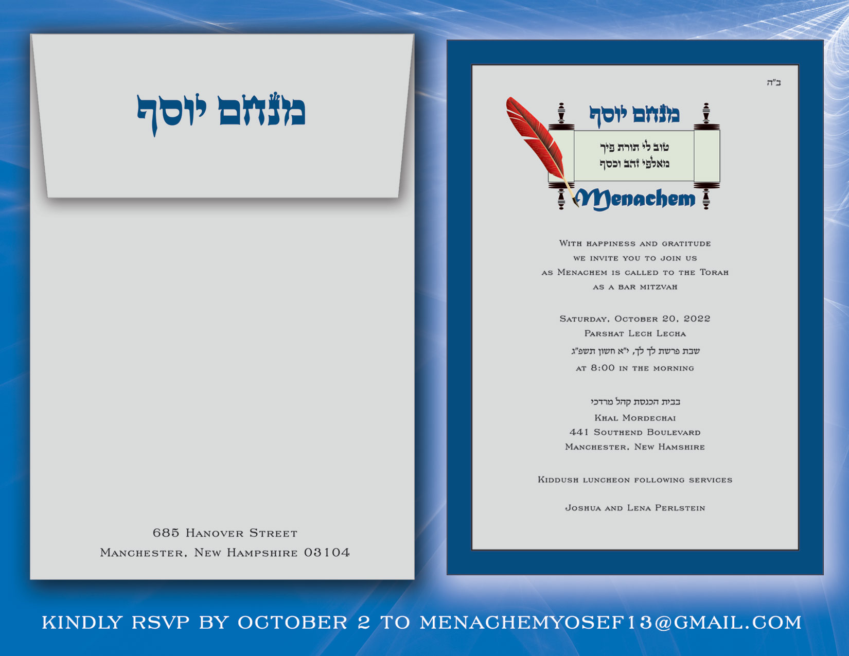 This is a digital Bar Mitzvah e-invitation only. Choose from the multiple designs shown here or suggest one of your own for us to create. Jewish Hebrew English Bar Mitzvah invitations.