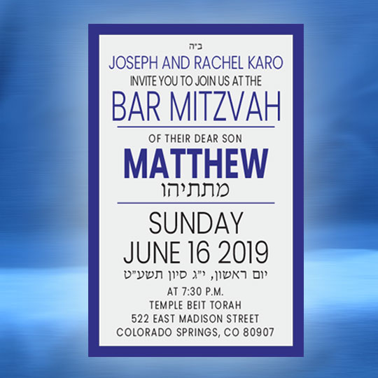 Both the Hebrew font choices and the English font choices have separate categories for selecting a font. One category is for the general text and one category is for selecting a font for your son’s name. This way you can be truly creative in setting a personal touch to your Bar Mitzvah invitation. Alternatively, you can request that we select the perfect fonts for you.