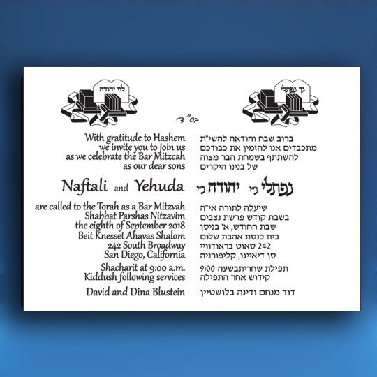 Shopping for Bar Mitzvah invitations for twins is twice the fun. This is one of our favorites. However feel free to choose any design you see or to suggest one of your own.