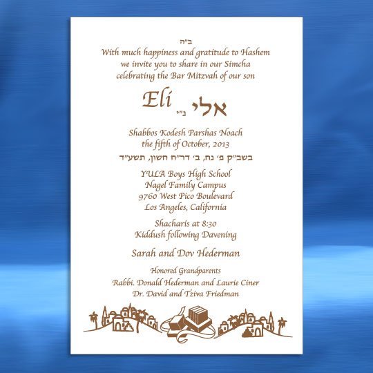 These beautiful Bar Mitzvah invitations symbolize the spiritual moment of the occasion with its hand drawn Jerusalem design and Tfillin overlay.