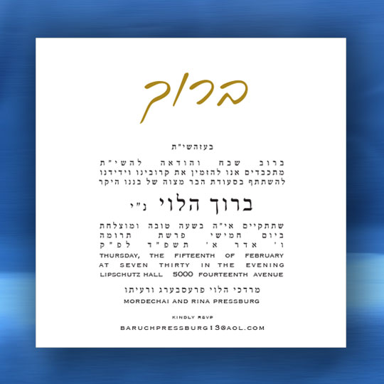 Both the Hebrew font choices and the English font choices have separate categories for selecting a font. One category is for the general text and one category is for selecting a font for your son’s name. This way you can be truly creative in setting  a personal touch to your Bar Mitzvah invitation. Alternatively, you can request that we select the perfect fonts for you.