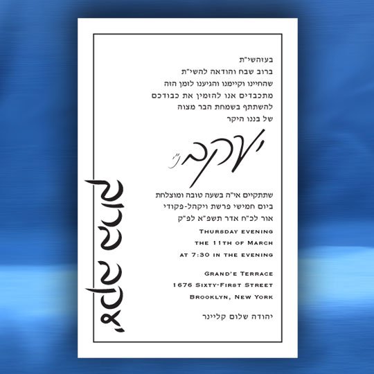 One of our more popular Bar Mitzvah invitations. It is available with or without the border. The name on the side can also be in English.