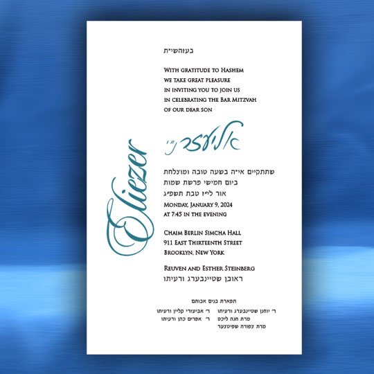Both the Hebrew font choices and the English font choices have separate categories for selecting a font. One category is for the general text and one category is for selecting a font for your son’s name. This way you can be truly creative in setting a personal touch to your Bar Mitzvah invitation. Alternatively, you can request that we select the perfect fonts for you.