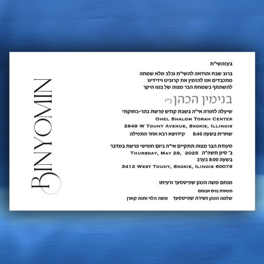 Both the Hebrew font choices and the English font choices have separate categories for selecting a font. One category is for the general text and one category is for selecting a font for your son’s name. This way you can be truly creative in setting  a personal touch to your Bar Mitzvah invitation. Alternatively, you can request that we select the perfect fonts for you.