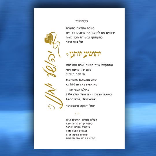 Both the Hebrew font choices and the English font choices have separate categories for selecting a font. One category is for the general text and one category is for selecting a font for your son’s name. This way you can be truly creative in setting a personal touch to your Bar Mitzvah invitation. Alternatively, you can request that we select the perfect fonts for you.