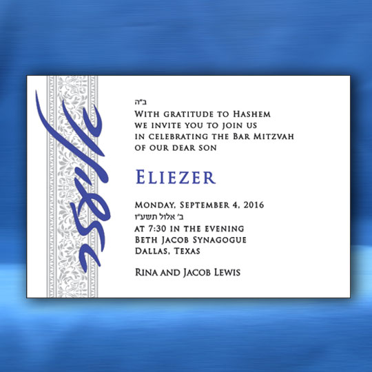 Both the Hebrew font choices and the English font choices have separate categories for selecting a font. One category is for the general text and one category is for selecting a font for your son’s name. This way you can be truly creative in setting a personal touch to your Bar Mitzvah invitation. Alternatively, you can request that we select the perfect fonts for you.