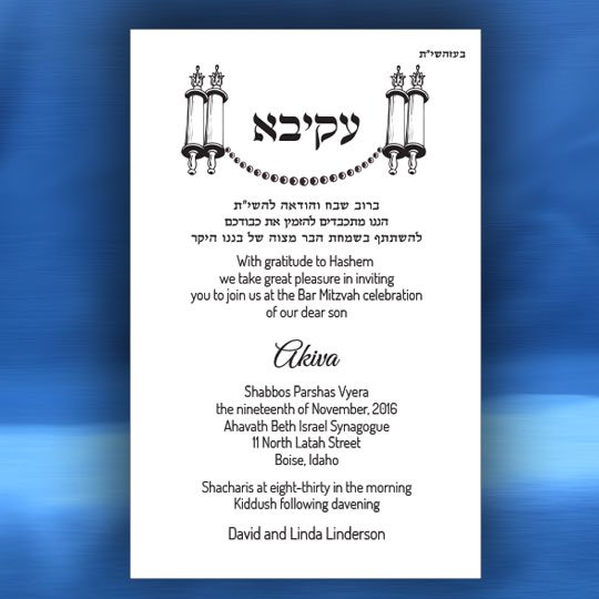 Both the Hebrew font choices and the English font choices have separate categories for selecting a font. One category is for the general text and one category is for selecting a font for your son’s name. This way you can be truly creative in setting a personal touch to your Bar Mitzvah invitation. Alternatively, you can request that we select the perfect fonts for you.