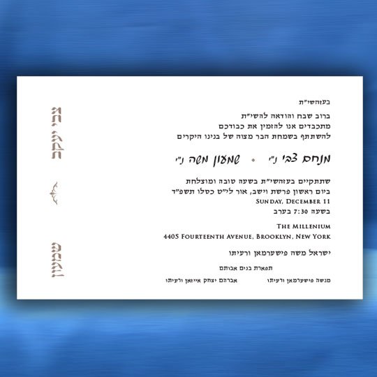 Both the Hebrew font choices and the English font choices have separate categories for selecting a font. One category is for the general text and one category is for selecting a font for your son’s name. This way you can be truly creative in setting a personal touch to your Bar Mitzvah invitation. Alternatively, you can request that we select the perfect fonts for you.