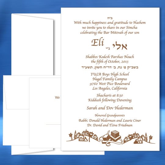 Flat Print: Combine it all in one graphic with this beautifully hand drawn Jerusalem design and Tfillin overlay. Bar Mitzvah invitations
