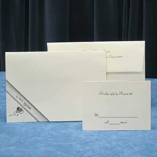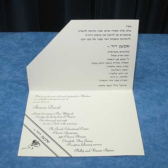 Horizontal Mock Cover Tfillin design. The concept of a mock cover design is to cut the cover of the invitation short, thus allowing for the design printed on the inside to be seen from the outside. This design, from among our Bar Mitzvah invitations, was designed to save the printing cost of the outside of the invitation. You can choose from a variety of our designs. Shown here with a line art of our elegant Tfillin design.