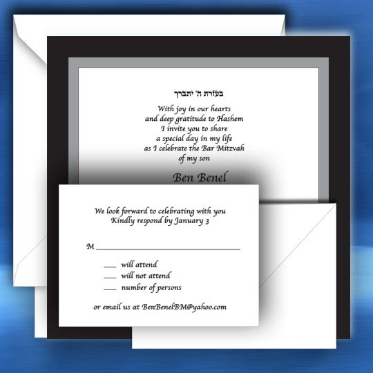 This magnificent square invitation with two backings is extremely versatile. Feel free to adjust layouts and colors. Envelope may not be an exact match to the card. Bar Mitzvah invitations