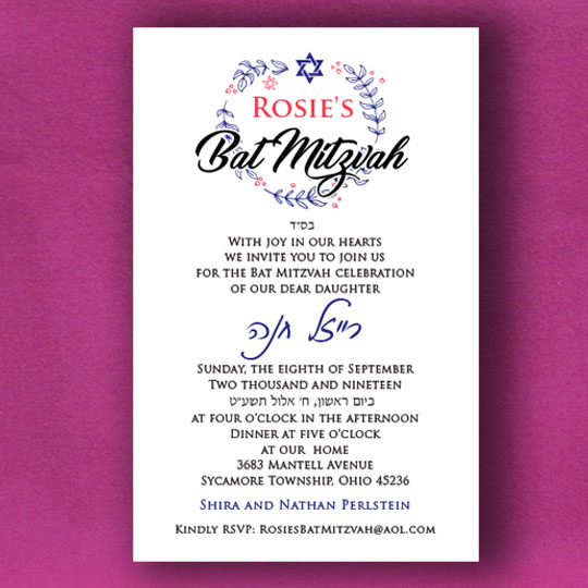 Please choose quantities for your Bat Mitzvah invitations and additional cards at the right. You will get to choose your Hebrew fonts, English Fonts, layout and monogram as you place your order.