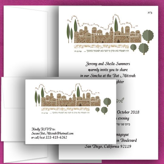 Blessings from Jerusalem incorporates the ideal of tradition. A truly heartwarming choice for your bat mitzvah invitations.