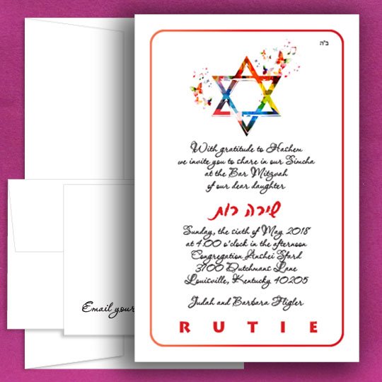 Combine youth and tradition with this creative and cheerful piece. Feel free to adjust this or any of our Bat Mitzvah invitations.