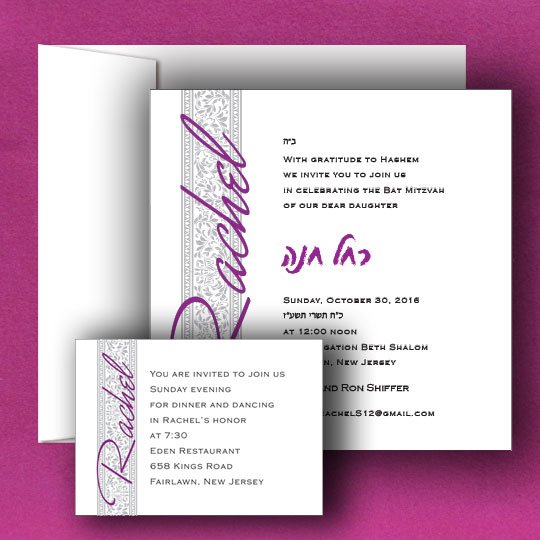 Enjoy the concept of up-to-date pattern designs when planning your Jewish affair the great moment of the Bat Mitzvah. Patterns are always fresh. Choose one of our intricate fonts for the names to add spunk and flavor.