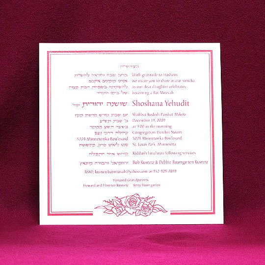 Here is another favorite design, among our Bat Mitzvah invitations. As a square it is always elegant. Add to that the spacious space available leaving ample room for creativity.