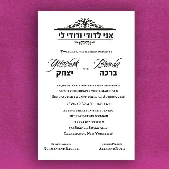 Both the Hebrew font choices and the English font choices have separate categories for selecting a font. One category is for selecting a font for the general text and one category is for selecting a font for the names of the Chosson and Kallah. This way you can be truly creative in setting a personal touch to your invitation. Alternatively, you can request that we select the perfect fonts for you.