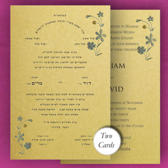 Please choose quantities for your Jewish Wedding invitations and additional cards at the right. You will get to choose your Hebrew fonts, English Fonts, layout and monogram as you place your order.