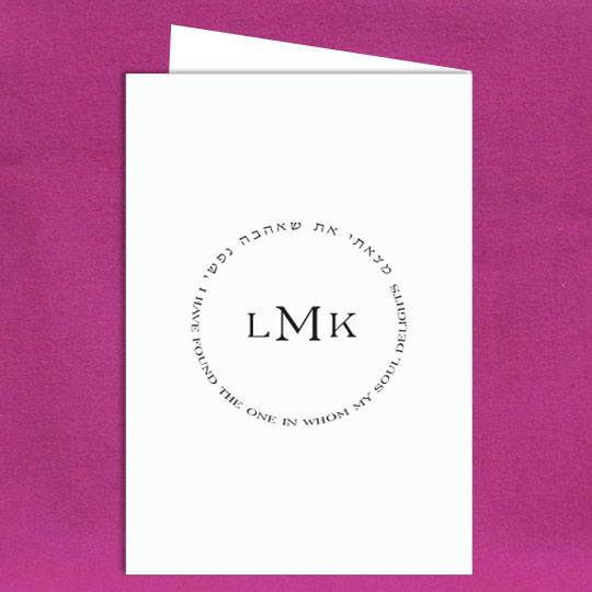 Combine a monogram with a phrase in a circle and you will have the perfect up to the minute latest design for your Jewish wedding invitations.