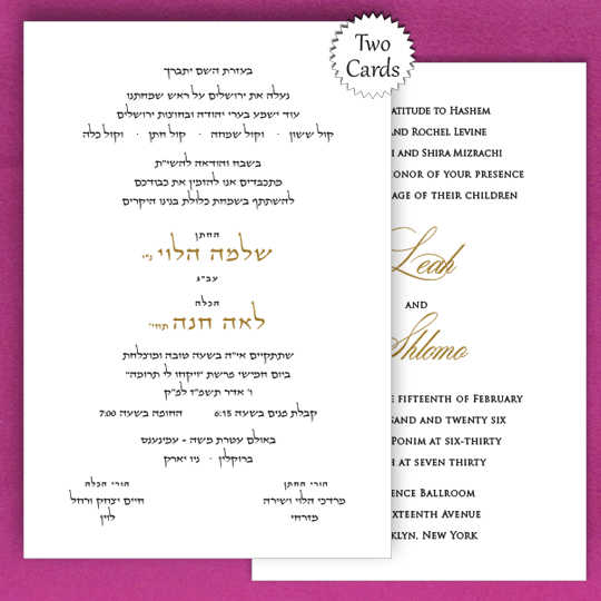 When looking for Jewish wedding invitations this is as classy as it can get. Two separate cards is what’s in and if you do the names in gold as well you have a top-of-the-world winner.