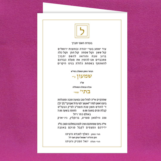 Enjoy the fine details of the border, the monogram, and the highlighted names is gold on this choice from our Jewish wedding invitations. This design is true class. You can use the colors as shown or selct any color.