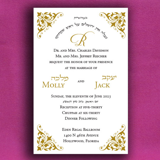 Up-to-date and as classy as can be. Here are all the important details for your Jewish wedding invitations combined in one rich looking card.