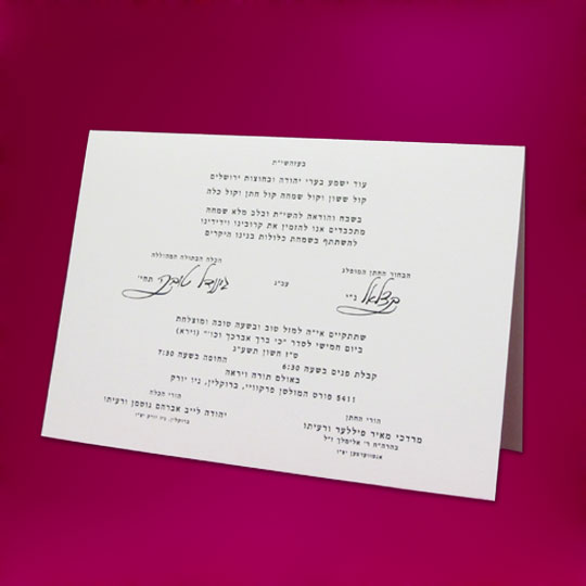 Here is fine quality at its best. This fine paper is enhanced by a pointed flap envelope for additional elegance. These Jewish wedding invitations have both a full Hebrew text and a full English text. You can switch to have the English text on the cover and the Hebrew text inside.