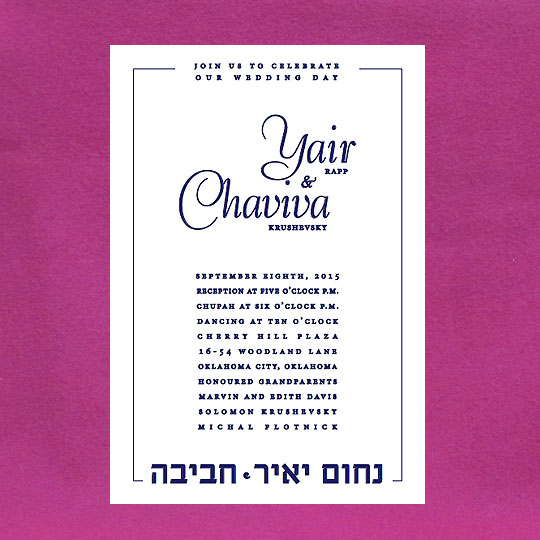 Both the Hebrew font choices and the English font choices have separate categories for selecting a font. One category is for selecting a font for the general text and one category is for selecting a font for the names of the Chosson and Kallah. This way you can be truly creative in setting a personal touch to your invitation. Alternatively, you can request that we select the perfect fonts for you.
