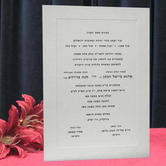 This invitation is popular for it’s excellent paper quality, full size pointed envelope flaps and panel design. You can put either a monongram design on the cover of these Jewish wedding invitations or you can put either the Hebrew or English text on the cover. The design is only limited to your imagination.