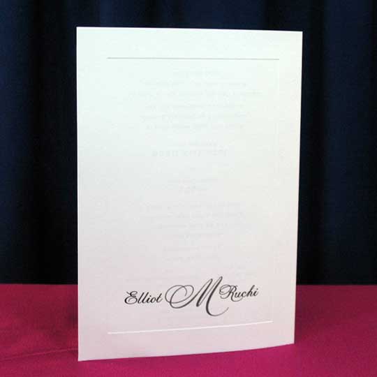This invitation is popular for it’s excellent paper quality, full size, classic panel and elegant pointy envelope flaps. If you have your own monogram design for these beautifully carved Jewish wedding invitations we can put that on the cover if you wish. Truly an upscale piece.