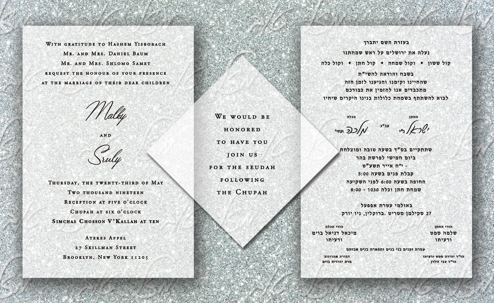 A soft look with the option of an additional card or cards with Mazel Tov faintly in the background. This is an E-invitation that is digitally set. It is used to send invitations via social media or email. We will design this based on your instructions and then send you a jpg file to use for distribution. You can also request a pdf file.