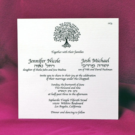 This is a great choice when looking for a little more room and a touch of elegance for your Jewish wedding invitations. This design is supplied with a standard tree stem and leaves only. Somewhat similar to the tree shown. Use as shown or request more Hebrew copy.