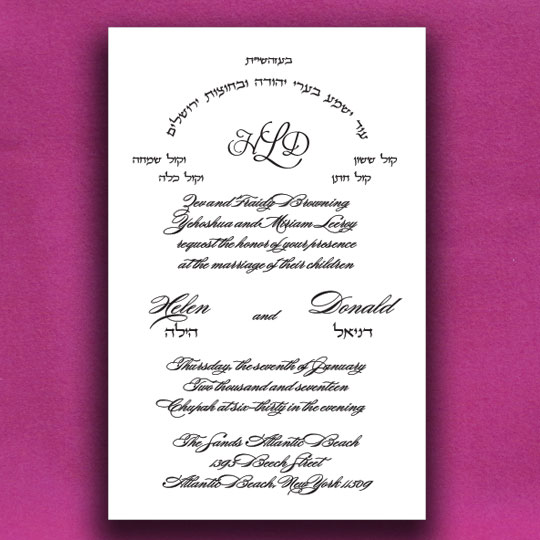A basic design for your Jewish wedding invitations. You can follow the layout as shown or suggest a monogram of your choice. If you would like for us to create a custom design for you please send us the letters for the design. We will create a monogram just for you. It is included in the low cost of this invitation.