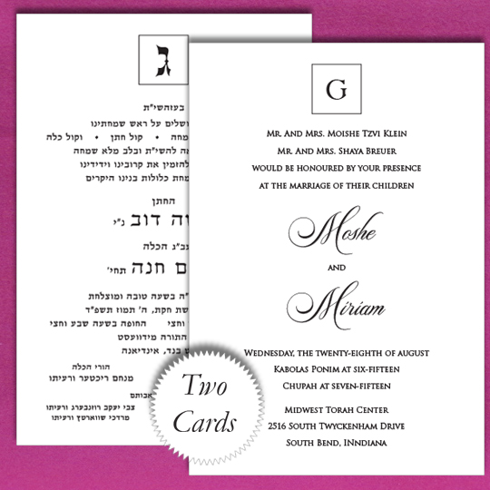 Another high quality paper stock and envelope. This one is in the one stamp only price group making it both economical and elegant. These beautiful Jewish Wedding invitations are printied with two separate cards. One card is for the Hebrew text. The other card is for the English text.