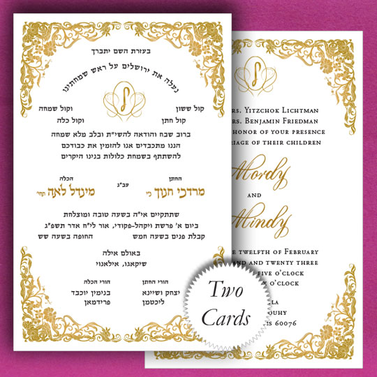 Please choose quantities for your Jewish Wedding invitations and additional cards at the right. You will get to choose your Hebrew fonts, English Fonts, layout and monogram as you place your order.