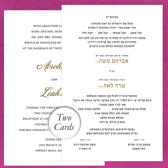 Please choose quantities for your Jewish Wedding invitations and additional cards at the right. You will get to choose your Hebrew fonts, English Fonts, layout and monogram as you place your order.