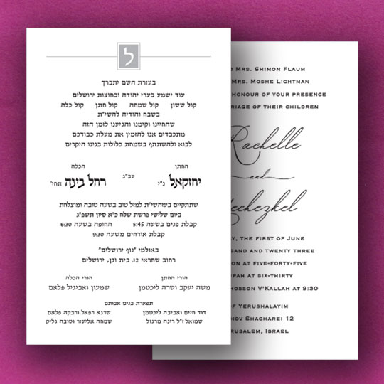 The latest idea in hebrew english invitations is 2 separate cards. It’s both elegant and low cost. You too can choose any font or layout. Both black and grey ink is included. Includes one side print. Second side print is available. Jewish Hebrew English wedding invitations