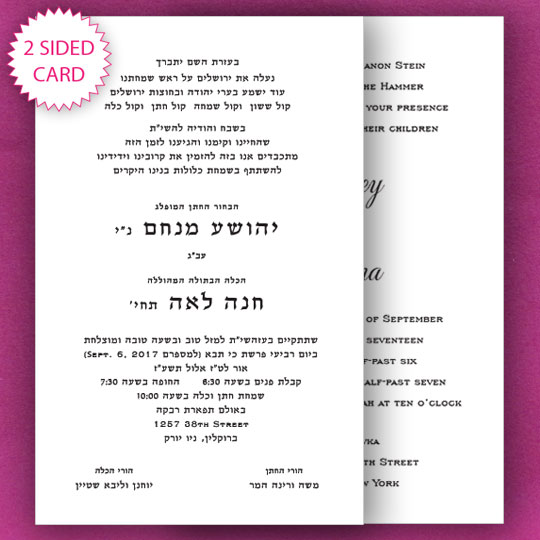 New and popular. Use a single card for both Hebrew and English Texts. It’s the latest fashion for invitations. Suggest any layout you like. Available also in 100 lb card. Slightly heavier.